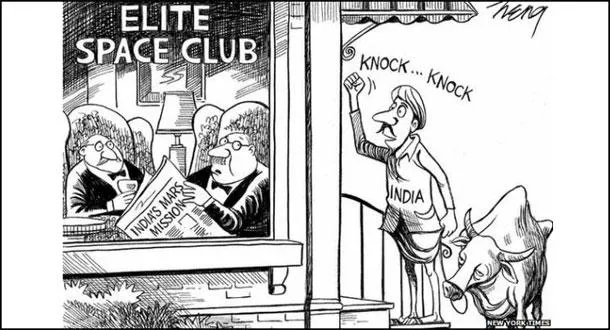 يظهر الرسم الكاريكاتيري مزارعا هنديا ومعه بقرة يقرع باب غرفة تمثل «نادي الفضاء النخبوي»، وبداخله رجلان يرتديان ربطة عنق (بابيون) ويقرآن صحيفة كتب عليها مهمة الهند إلى المريخ.