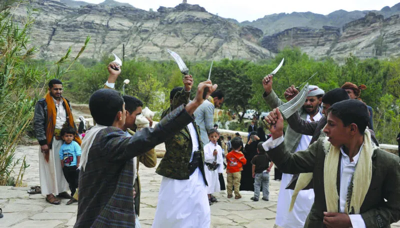 يمنيون يؤدون رقصة فولكلورية برفع الخناجر بمناسبة عيد الأضحى المبارك في واد قريب من العاصمة صنعاء أمس (إ.ب.أ)