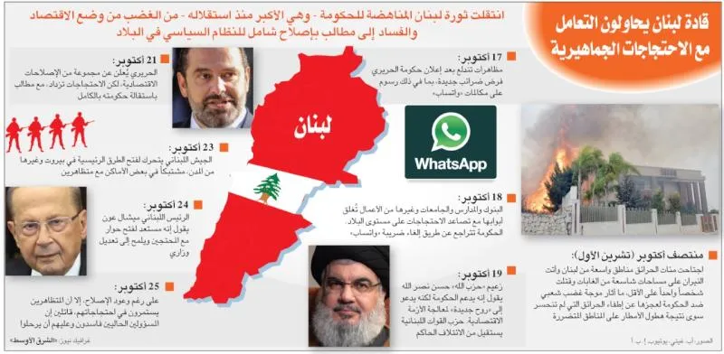 ويسعى القادة السياسيون في لبنان إلى احتواء الاحتجاجات التي أطلق شرارتها فرض ضرائب على مكالمات تطبيق «واتساب»، وكان قد سبقها حرائق هائلة اجتاحت مناطق واسعة من الغابات في البلاد ما أثار سخطاً شعبياً.