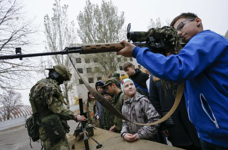 مقاتل يدرب تلامذة على استعمال السلاح في دونيتسك شرق أوكرانيا (أرشيف – إ.ب.أ)