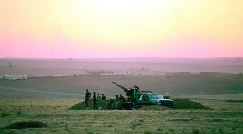 قوات من البشمركة الكردية بالقرب من مدينة ربيعة على الحدود العراقية السورية أمس (رويترز)