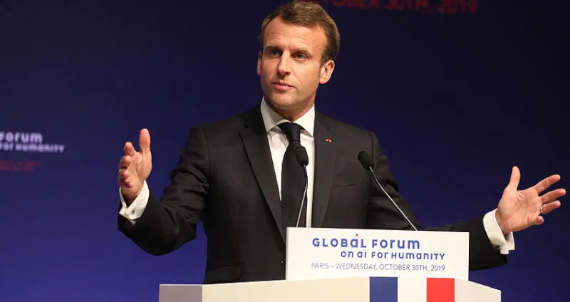الرئيس الفرنسي لدى إلقائه كلمة أمام مؤتمر «الذكاء الصناعي من أجل الإنسانية» في باريس أمس (إ.ب.أ)