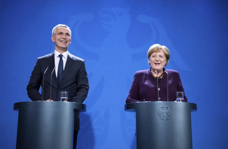 المستشارة الألمانية أنجيلا ميركل والأمين العام لحلف شمال الأطلسي ينس ستولتنبرغ (أ.ف.ب)