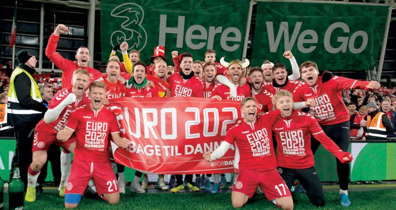 لاعبو منتخب الدنمارك يحتفلون بتأهلهم بعد التعادل الصعب مع آيرلندا (إ.ب.أ)