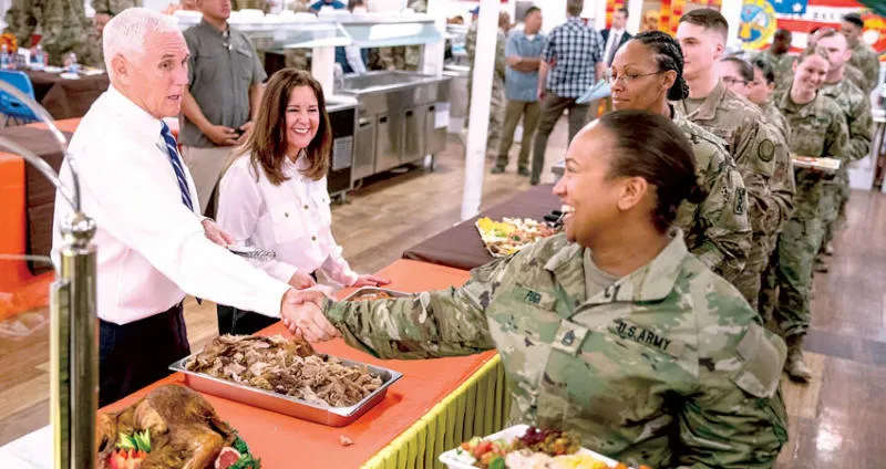 نائب الرئيس الأميركي مايك بنس وزوجته يقدمان الطعام للجنود الأميركيين في قاعدة «عين الأسد» بمحافظة الأنبار غرب العراق أمس (أ.ب)