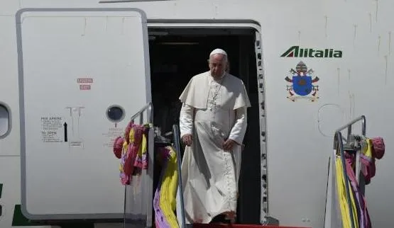 البابا فرنسيس خلال وصوله إلى بانكوك الأربعاء الماضي (ا.ف.ب)