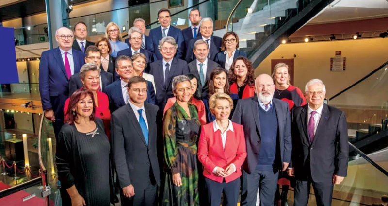أورسولا فون دير لاين مع فريق عملها أمس بعد المصادقة عليه من البرلمان الأوروبي (إ.ب.أ)