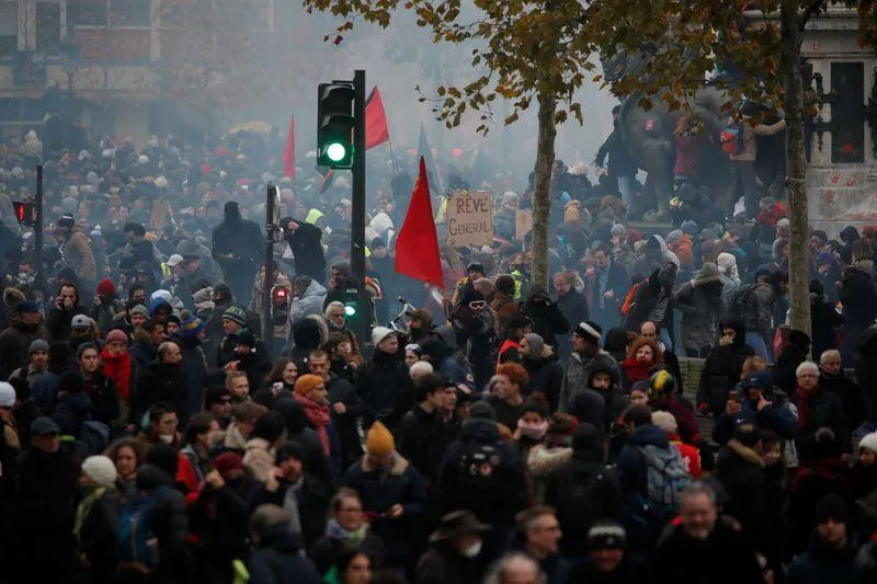 محتجون ضد خطة للحكومة الفرنسية لنظام معاشات التقاعد يتجمعون في باريس (رويترز)