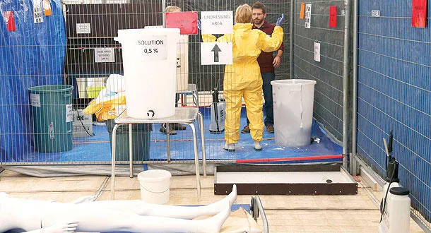 متطوع يتلقى تدريبا لدى مركز تابع لمنظمة «أطباء بلا حدود» في بروكسل حول كيفية التعامل مع المصابين بإيبولا أمس (رويترز)