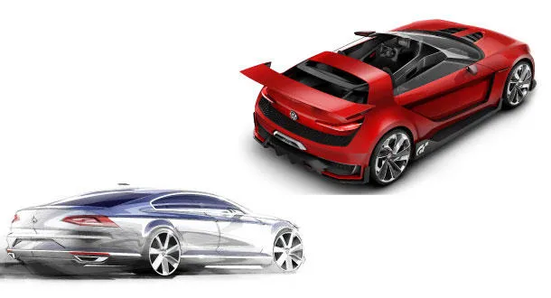 (في الاعلى) سيارة فولكس فاغن التجريبية الجديدة، و تصميم أولي لسيارة باسات الجديدة