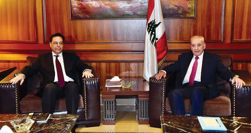 رئيس الحكومة المكلف حسان دياب مجتمعاً أمس مع الرئيس نبيه بري مع بدء الاستشارات النيابية (الوكالة الوطنية)
