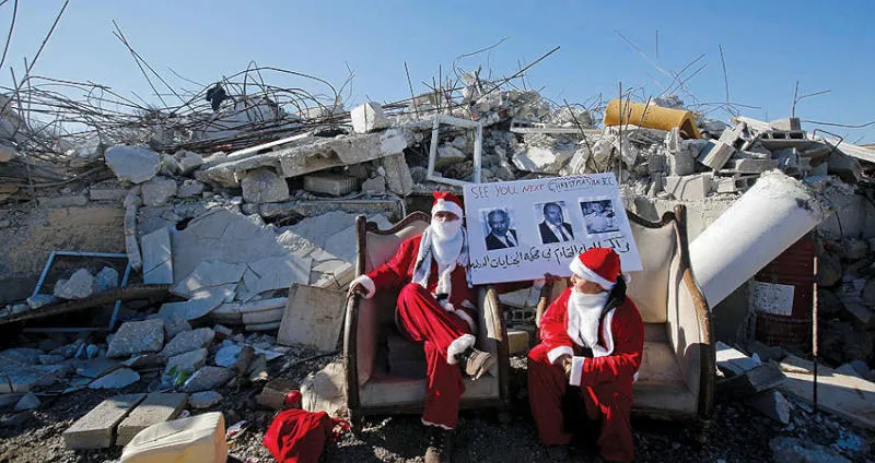 فلسطينيان برداء سانتا كلوز يحتجان على هدم بيوت في الضفة (رويترز)