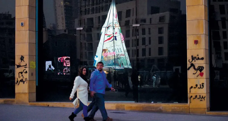 شجرة ميلاد مصنوعة من لافتات التظاهر وسط بيروت (إ.ب.أ)