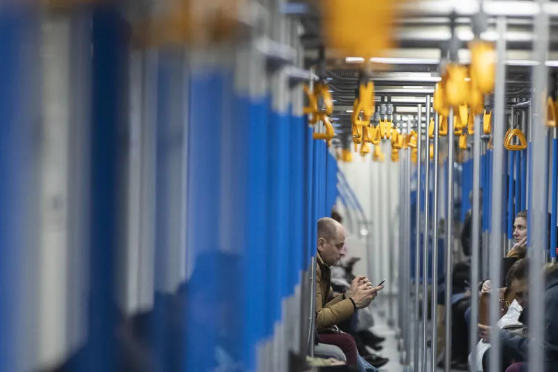 مواطن روسي يستخدم الهاتف الجوال في أحد القطارات بموسكو (أ.ب)