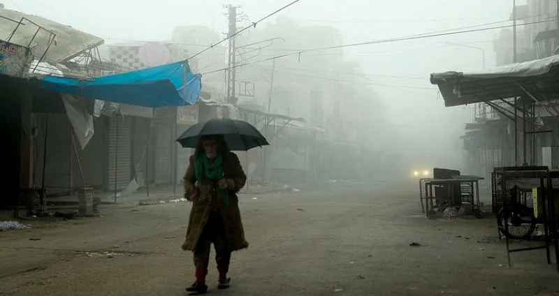 رجل مع مظلته في معرة النعمان الخالية من غالبية سكانها أمس (أ.ف.ب)