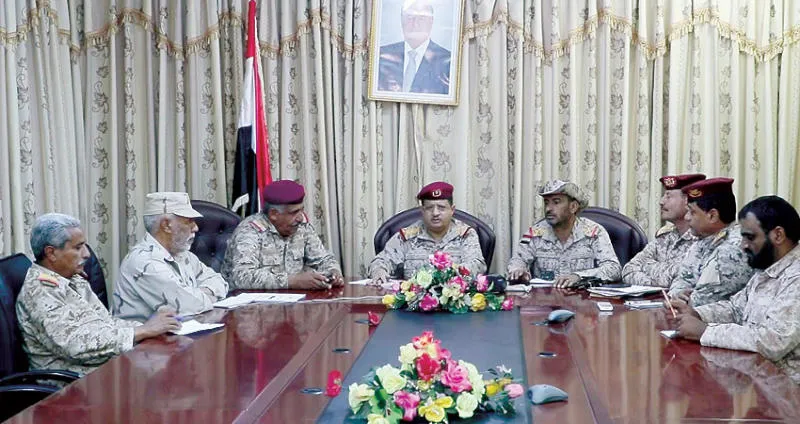 وزير الدفاع اليمني الفريق الركن محمد المقدشي لدى لقائه قيادات عسكرية في مأرب أمس (سبأ)