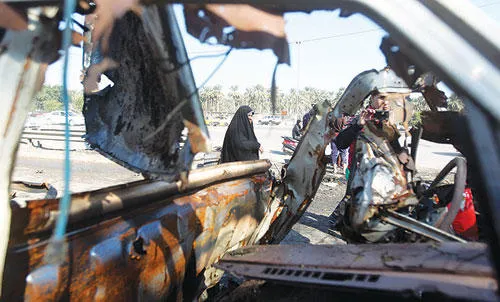 عراقية تمر بجانب حطام سيارة في موقع انفجار بمنطقة الطوبجي ببغداد أمس (أ.ف.ب)
