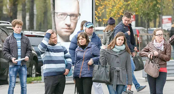 أوكرانيون يقفون أمام صورة دعائية لرئيس الوزراء أرسيني ياتسينيوك في كييف أمس استعدادا لانتخابات الأحد المقبل (رويترز)