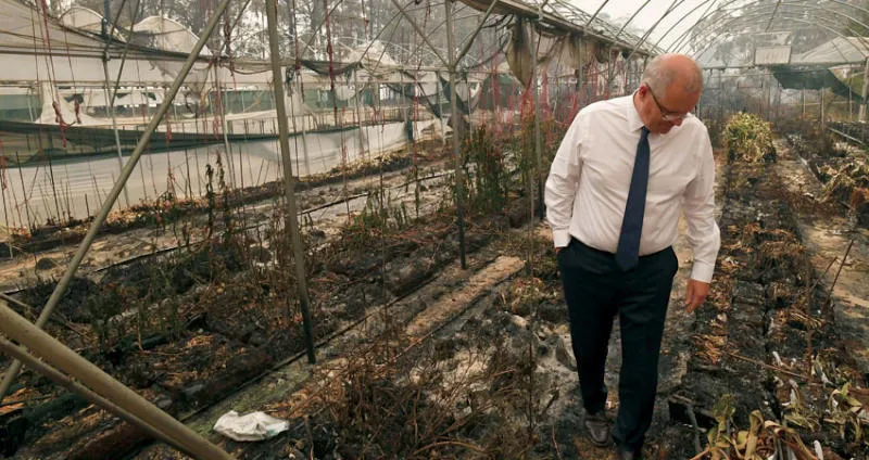 رئيس الوزراء الأسترالي سكوت موريسون يزور منطقة الحرائق في فيكتوريا أمس ويواجه غضب السكان والانتقادات (أ.ب)
