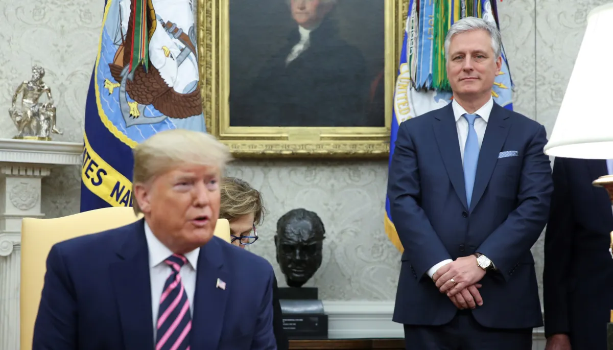 مستشار الأمن القومي الأميركي روبرت أوبراين (يمين) يستمع للرئيس الأميركي في البيت الأبيض (أرشيفية - إ.ب.أ)