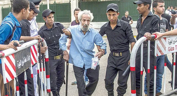 عناصر من الشرطة المصرية يساعدون مسنا نجا من الانفجار في القاهرة أمس (أ.ف.ب)