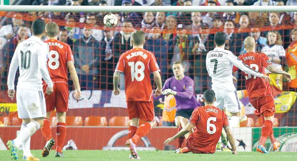 رونالدو نجم الريال (رقم 7) يراقب تسديدته وهي في طريقها لشباك ليفربول (أ.ب)