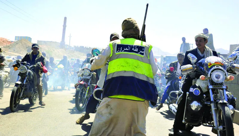 عنصر من جماعة الحوثي يعمل على تنظيم سير مظاهرة معارضة بالدراجات النارية ضد قرار لحظرها أمس في صنعاء (إ.ب.)