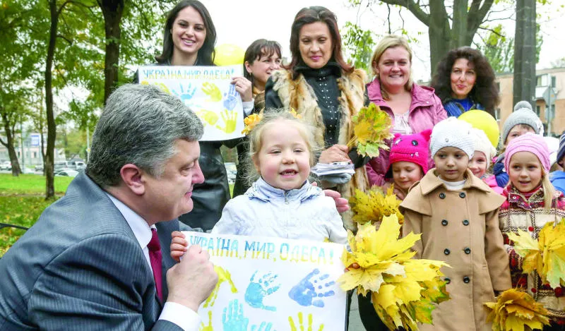 بوروشينكو يجلس إلى جانب أطفال خلال زيارته مدينة أوديسا على البحر الأسود أمس. وكتب على اللافتة المرفوعة «أوكرانيا، سلم، أوديسا» (رويترز)