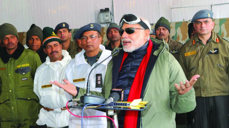 مودي أثناء حديثه للجنود المتمركزين في منطقة سياشن الجبلية بإقليم كشمير أمس (أ.ف.ب)
