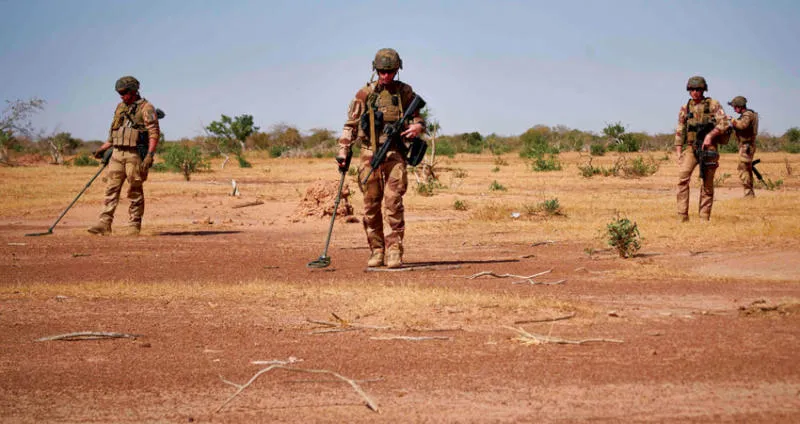 جنود فرنسيون يمسحون الأرض بحثاً عن ألغام في بوركينا فاسو في نوفمبر 2019 (أ.ف.ب)