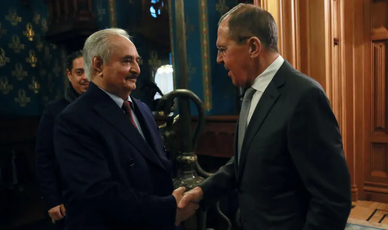 المشير خليفة حفتر يصافح وزير الخارجية الروسي سيرغي لافروف خلال زيارته قبل محادثات في موسكو (رويترز)