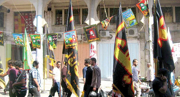 عراقيون يقطعون شارع المتنبي وسط بغداد بينما تتهادى رايات وشعارات أمس بمناسبة بدء شهر محرم (إ.ب.أ)