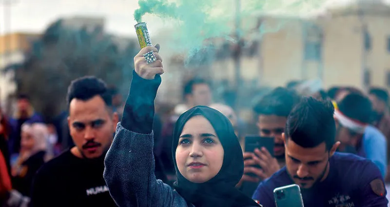 عراقيون خلال احتجاجات على هامش «مهرجان الألوان» خارج جامعة الكوفة في مدينة النجف أمس (أ.ف.ب)