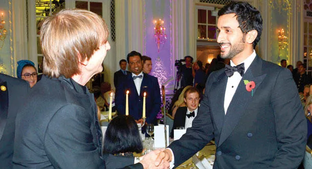 الشيخ ناصر بن حمد لدى استقباله أحد المشاركين في الحفل الذي نُظم أول من أمس في لندن