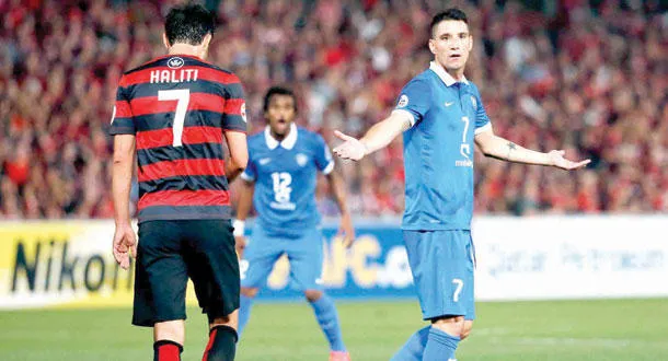 البرازيلي نيفيز يعاتب أحد زملائه بعد هجمة هلالية مهدرة (رويترز)
