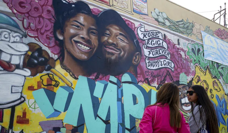 فتاتان تقفان أمام جدارية رُسمت تخليداً للأسطورة كوبي براينت وابنته جيانا في لوس أنجيلس (أ.ب)