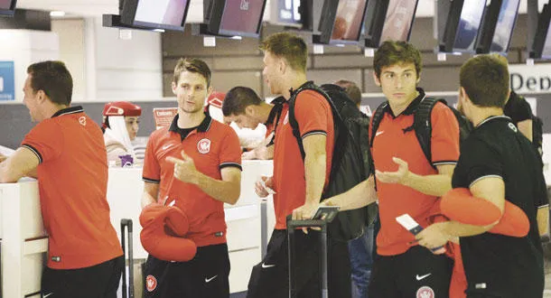 لاعبو الفريق خلال مغادرتهم من مطار سيدني وهم يخضعون لإجراءات السفر إلى الرياض