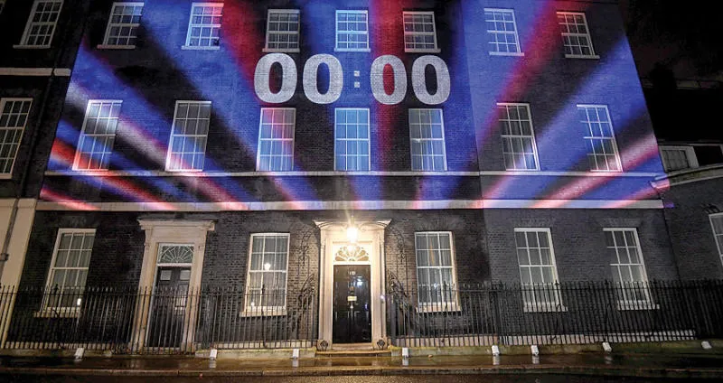 ساعة العد العكسي كما بدت على مقر رئاسة الوزراء في داونينغ ستريت أمس (رويترز)