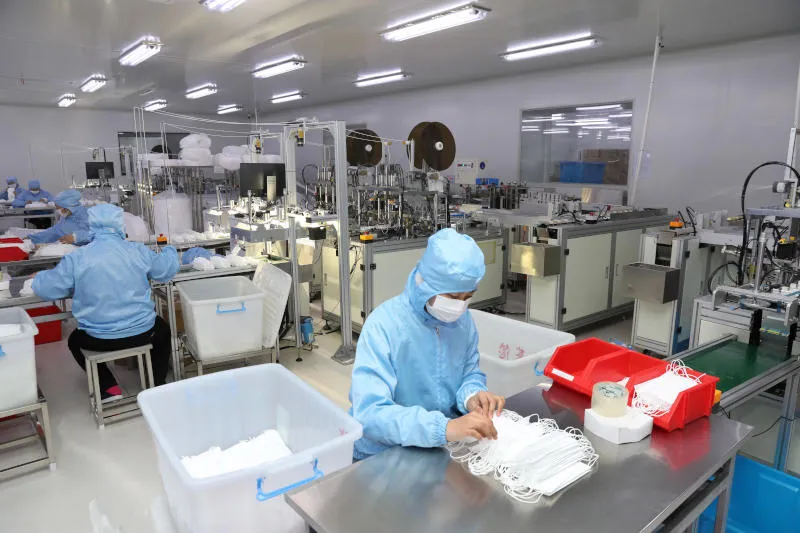 موظفون صينيون يعملون في ورشة لمؤسسة معنية بتصدير المنسوجات لإنتاج 200000 قناع يومياً للمساعدة في الوقاية من فيروس «كورونا» (د.ب.أ)