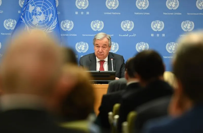الأمين العام للأمم المتحدة أنطونيو غوتيريش يتحدّث في مقر الأمم المتحدة (أ.ف.ب)