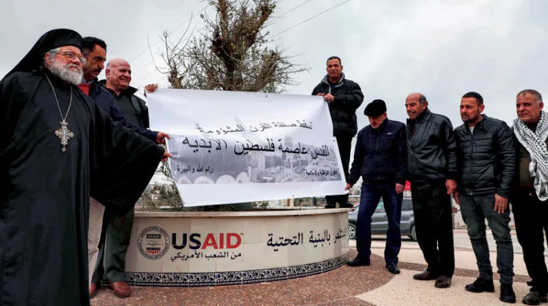 ممثل الكنيسة اليونانية الكاثوليكية في رام الله شارك في احتجاجات فلسطينيين أمس ضد صفقة القرن (أ.ف.ب)