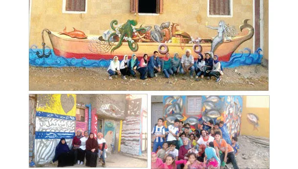 ويشدني بيده الملطخة بالألوان الطفل منصور لأتوجه لسيدة على مقربة منا ترجوني أن يهديها الفنانون رسمة على جدار بيتها، وتقول، وهي تشير إلى الجدار: «أنا نظفته وغسلته، ولو عايزين أدهن لهم الأرضية معنديش مانع». وبالفعل استجاب أحد الفنانين، ووضع لسماته الفنية على الجدار، في لوحة مبهجة اختلطت فيها الطيور والزوارق والنباتات بزرقة السماء.