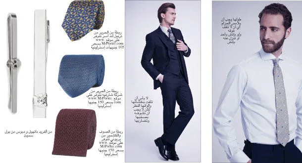 - عرضها أيضا مهم وله قواعد، كأن تكون رشيقة لكن ليست نحيفة كتلك التي يظهر بها مغنيو الروك أند رول ويروج لها هادي سليمان، مصمم دار سان لوران. يفضل أن تكون بإنشين وثلث أو إنشين أو ربع حتى تناسب المكتب أو حفل عشاء. عندما تكون سميكة وعريضة، فإنها تبدو مغرقة في الرسمية تستحضر رجلا محافظا تعدى الستين.