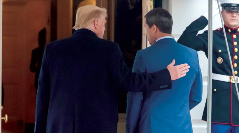 غوايدو ضيف شرف الرئيس ترمب في البيت الأبيض حيث كانت واشنطن محطته الأخيرة في جولة حول العالم (إ.ب.أ)