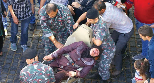 والدة أحد الجنود المختطفين من قبل {داعش} و{النصرة} أثناء إنقاذها بعد محاولة إشعال النيران في جسدها في بيروت أمس (أ.ب)