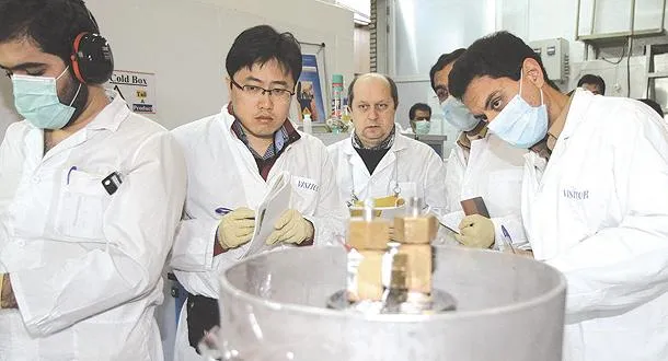 مفتشو الوكالة الدولية للطاقة الذرية مع فنيين إيرانيين في مفاعل نطنز جنوب طهران للتأكد من وقف التخصيب فوق مستوى 20 في المائة (أ.ف.ب)