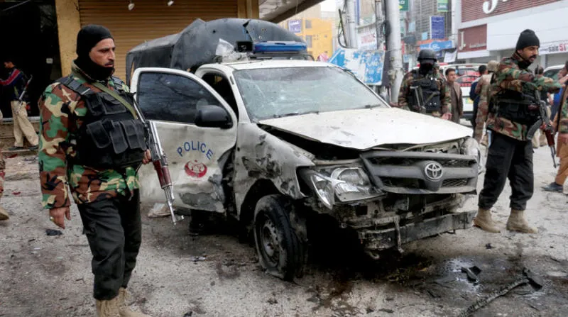 جنود أفغان قرب موقع تفجير سيارة مفخخة في مدينة كويتا الحدودية أمس (رويترز)