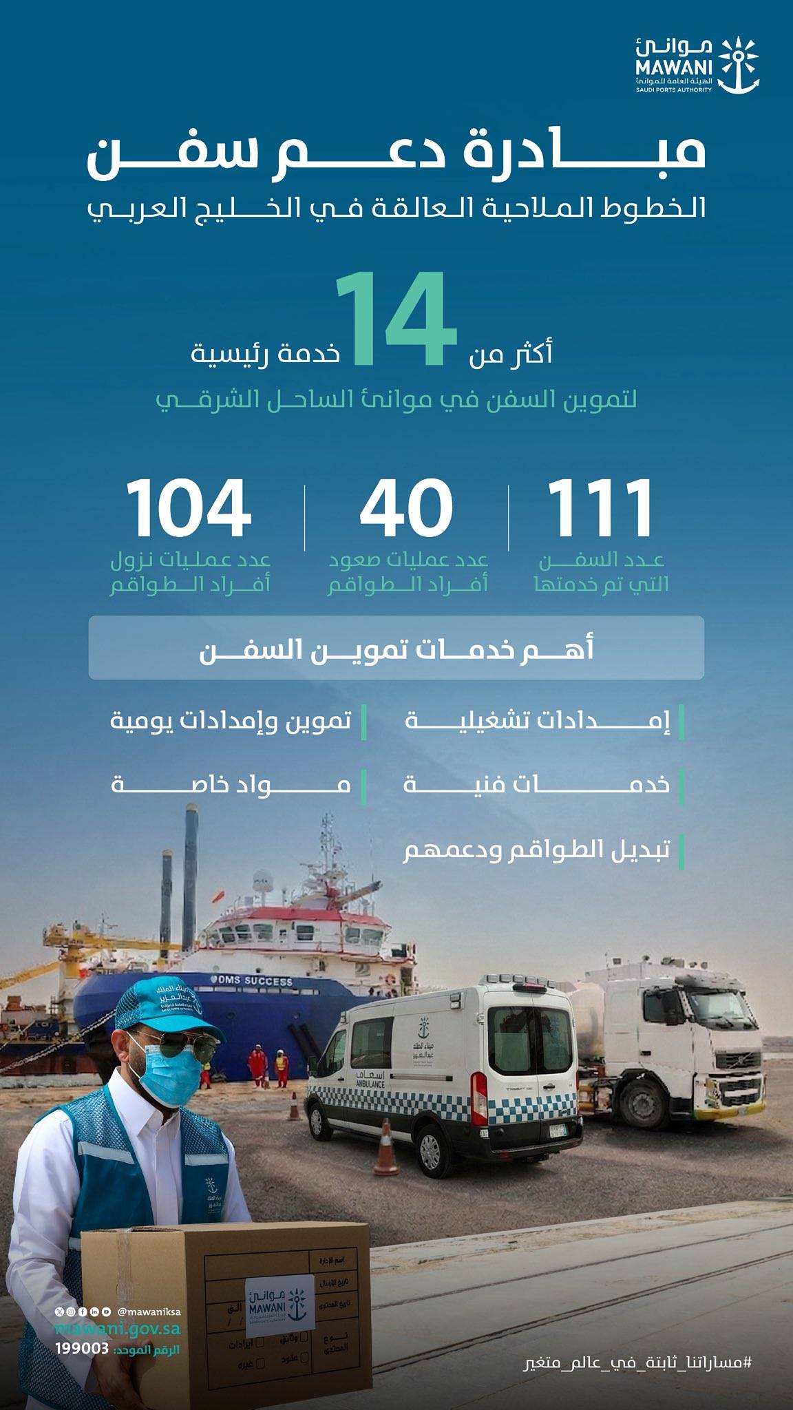 يُذكر أن الهيئة العامة للموانئ تعمل حثيثاً لتنفيذ أهداف قطاع الموانئ وتطوير استراتيجياته، ورسم خطى متكاملة ومدروسة لرفع قدرات الموانئ السعودية وإمكاناتها المتطورة وخدماتها التشغيلية واللوجيستية بما يرتقي بمستوى تنافسية الاقتصاد السعودي بين دول العالم، ويعطي موانئنا دوراً محورياً في الاقتصاد العالمي، تحقيقاً لأهداف المملكة التنموية.