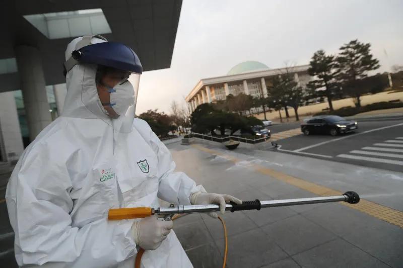 عامل يرش المطهر في سيول كإجراء احترازي في إطار جهود مكافحة فيروس كورونا (أ.ب)
