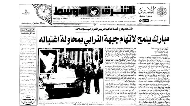 تولى حسني مبارك رئاسة مصر في 14 أكتوبر (تشرين الأول) 1981، خلفاً للرئيس المغتال أنور السادات. صفحة «الشرق الأوسط» الأولى في ذلك اليوم وثّقت ذلك، وانفردت بلقاء خال زوجة مبارك البريطاني الذي قال: «حسني رجل رائع ولا يتحمل أي كلام فارغ... وسوزان ستنجح في مهمتها وتقف وراء رجلها»، وصاحب الخبر صورة خاصة بالصحيفة وهي لقطة عائلة تجمع بين حسني مبارك وعائلته بما فيها زوجته سوزان ونجله علاء الدين (21 عاماً)، ونجله جمال الدين (19 عاماً) آنذاك.